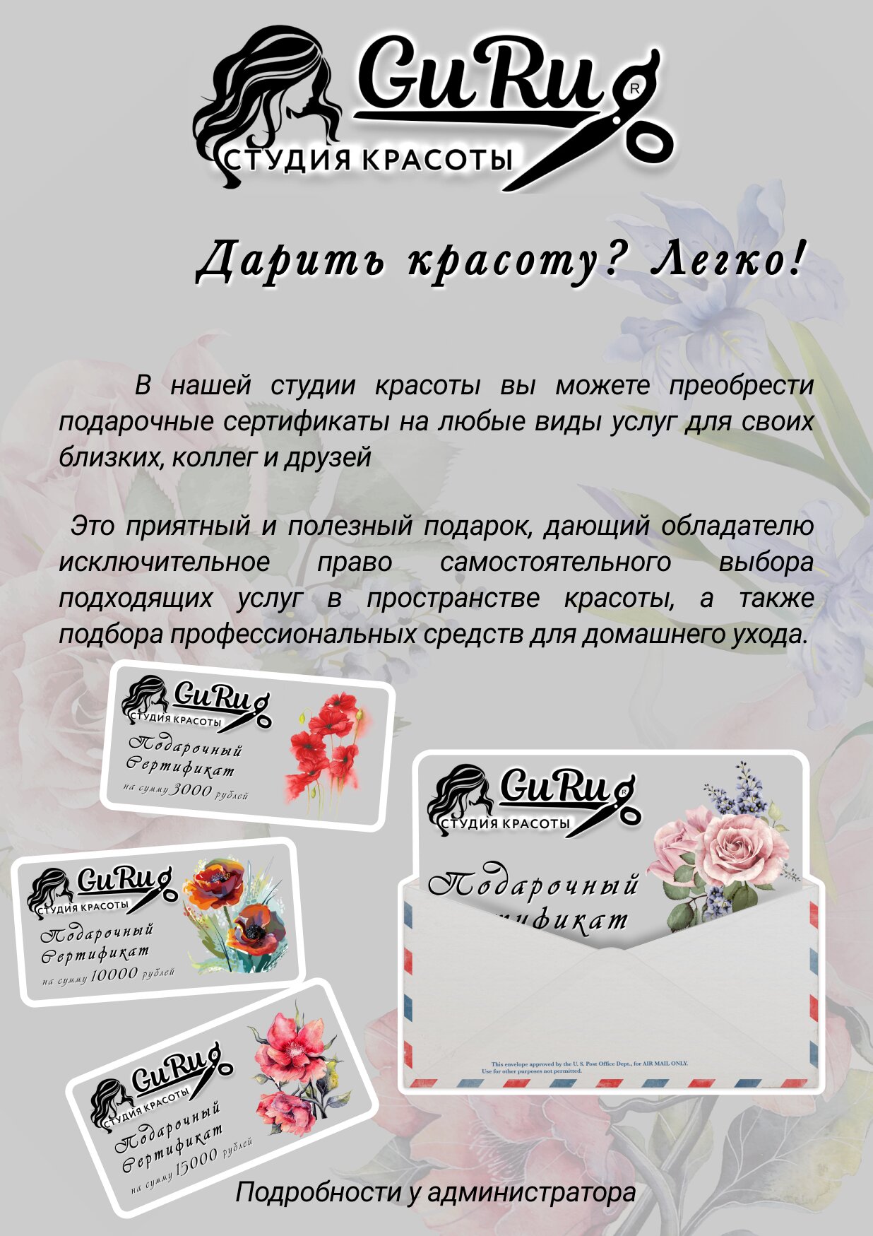 Была в салоне красоты Guru у мастера Гури. Делали с ней шатуш балаяж и ботекс для выпрямления волос. Сама процедура занимает много времени, зато делают очень качественно, аккуратно и с вниманием. В самой студии прекрасная обстановка, играет музыка, можно смотреть клипы. На ресепшене приветливая девушка, предлагает чай, кофе.
